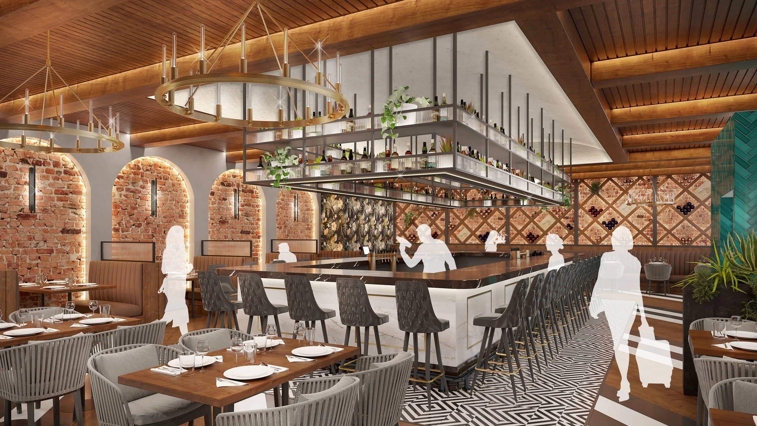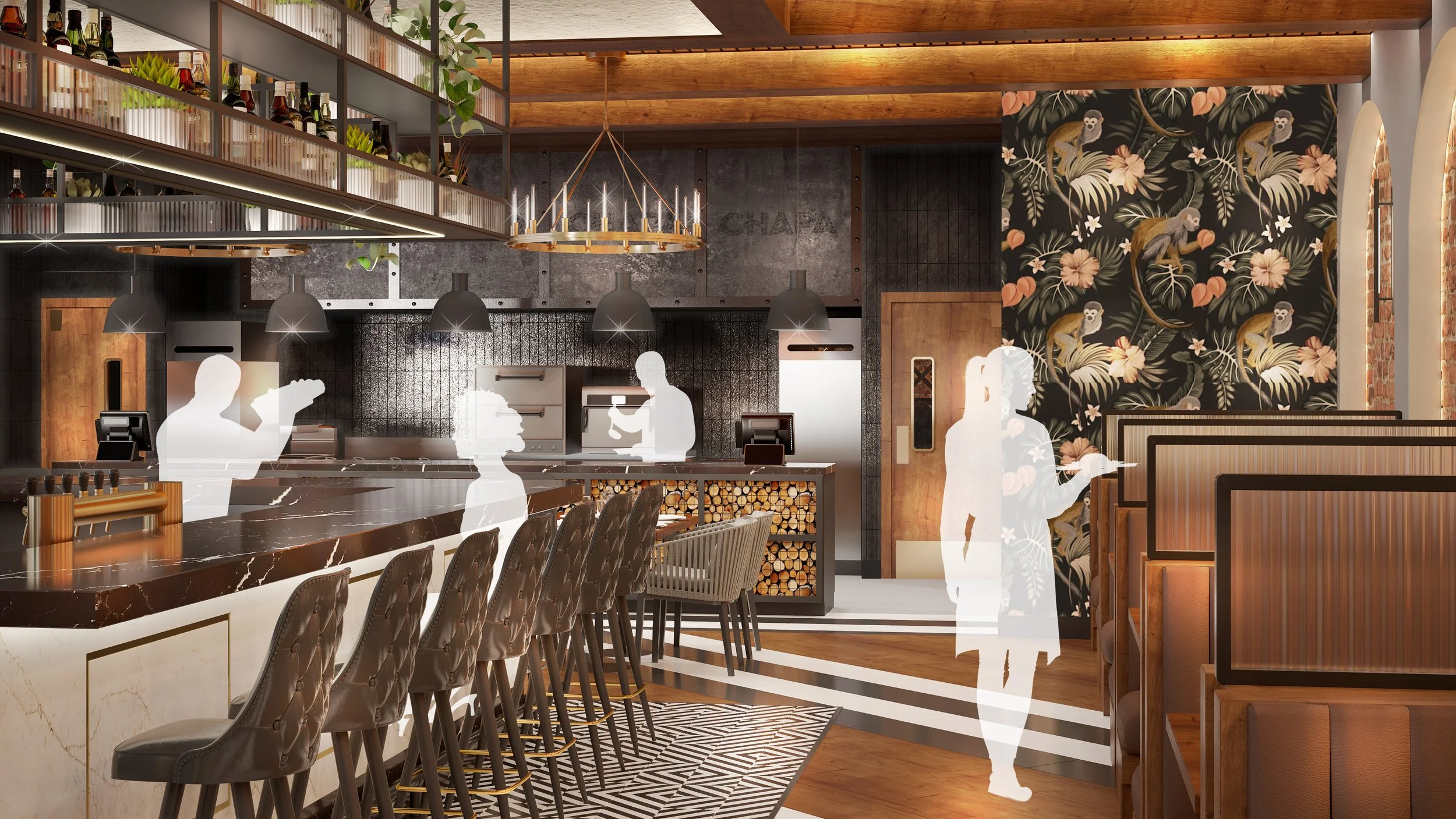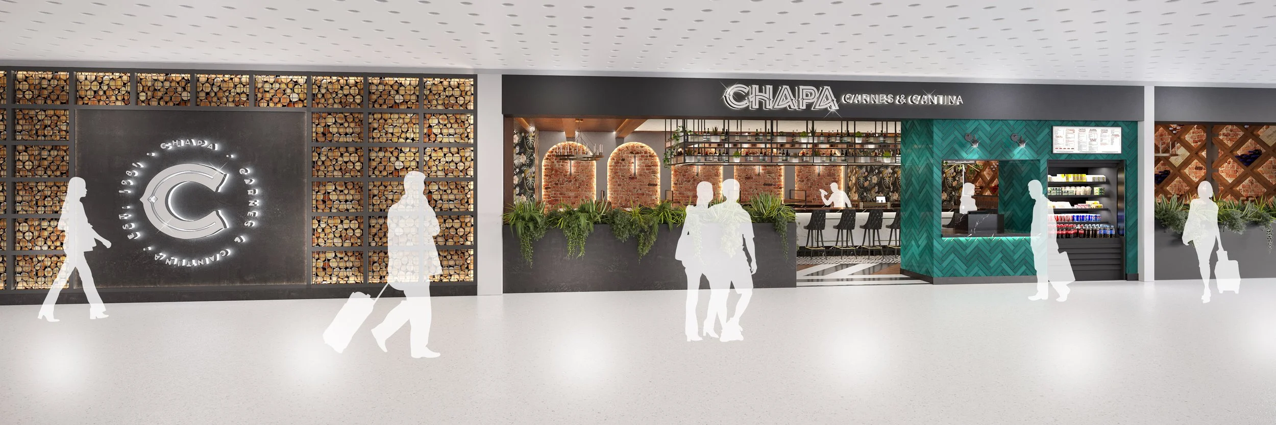 Chapa Carnes & Cantina at Abraham González International Airport blends rustic sophistication with a bold, modern flair. Exposed brick, rich wood tones and lush greenery evoke the warmth of a traditional cantina, while dramatic lighting, jungle-inspired wallpaper and geometric tile add contemporary edge. The centerpiece bar, framed by elegant chandeliers and a suspended liquor display, invites travelers to linger in style. It's a refined yet approachable space that celebrates regional character with a global twist.
